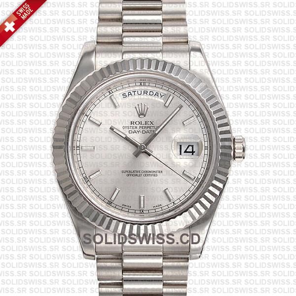| CASE | Solid 904L Stainless Steel Real 18K White Gold PVD Plated New Rolex oversized case 41mm – same as genuine 1 piece forged case construction Detailed prints and engravings 100% same as genuine One piece solid screw down crown with “O” ring Swiss PHE rubber seals ROLEXROLEX engraving on Rehaut Smoothed edges Hand finished Made with a genuine watch as sample completely disassembled and then all parts cloned using the most advanced CAD/CAM, modular molds and CNC Laser Machines. All parts are interchangeable with genuine. Size 100% same to original Serial Number Inscribed in Bezel Each watch is individually serialized |