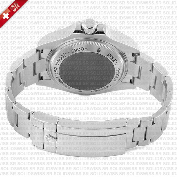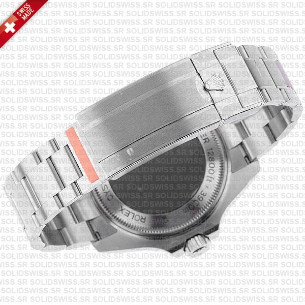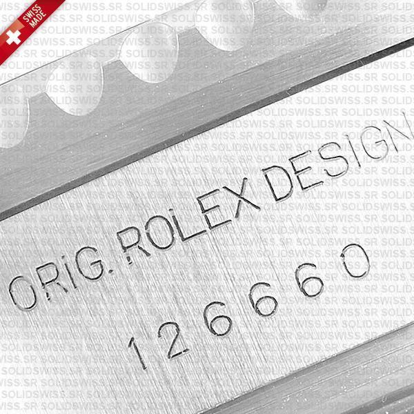 | CASE | – 44mm Solid 904L Stainless steel monobloc construction (Same as Genuine Rolex steel) – Screw-down Case back in grade 5 Titanium. Triplock one piece solid screw down crown – Working Helium Release Valve – ROLEXROLEX laser engraving on Rehaut ring – DLC scratch-protection coating – Dimensions and weight 100% identical with genuine. All parts can be interchanged with an original – Rolex Ref. 126660  |