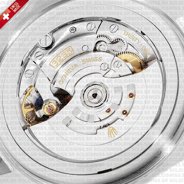 | MOVEMENT | – Rolex 3235 Swiss Cloned• – Correct serial numbers and identical markings inside and out. Not even your jeweler could tell the difference! – Oscillator: Anti magnetic BLUE hairspring (Parachrom) – Glucydur gilt – anti-magnetic balance wheel – All parts are interchangeable with the original – Automatic, mechanical bidirectional self-winding via perpetual rotor – Smooth Sweeping Seconds Hand Motion, 28.800 VPH (4Hz) – 31 Jewels (Red rubies) – Swiss Nano-Oil lubricated  |