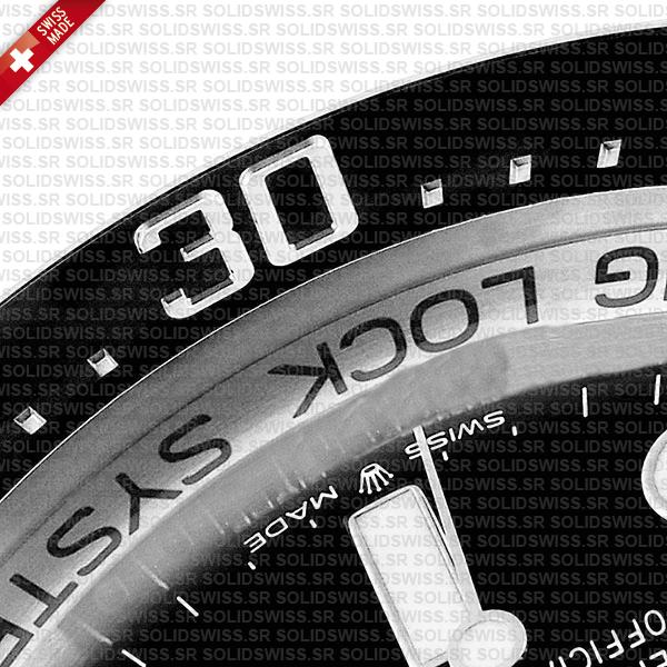 | BEZEL | – 120 clicks, unidirectional rotatable 60-minute graduated – Black, Scratch-resistant Ceramic insert with numerals and graduations coated in real platinum – Blue Superluminova coated pearl, design 100% same as Genuine  |