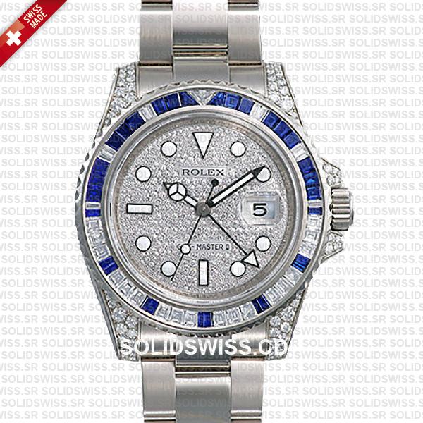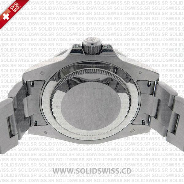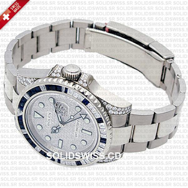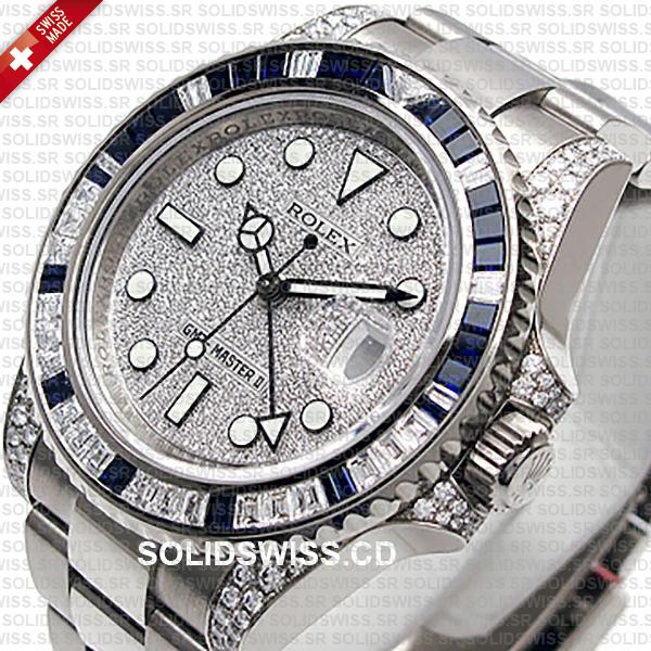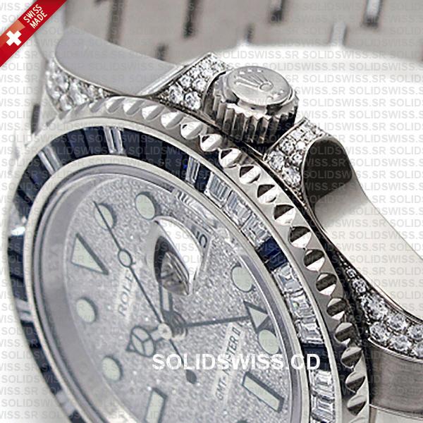 | BEZEL | 24-hour graduated, bidirectional rotatable with blue and clear real Moissanite diamonds. Construction and design 100% same as Genuine. |